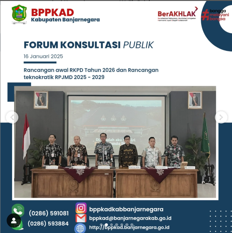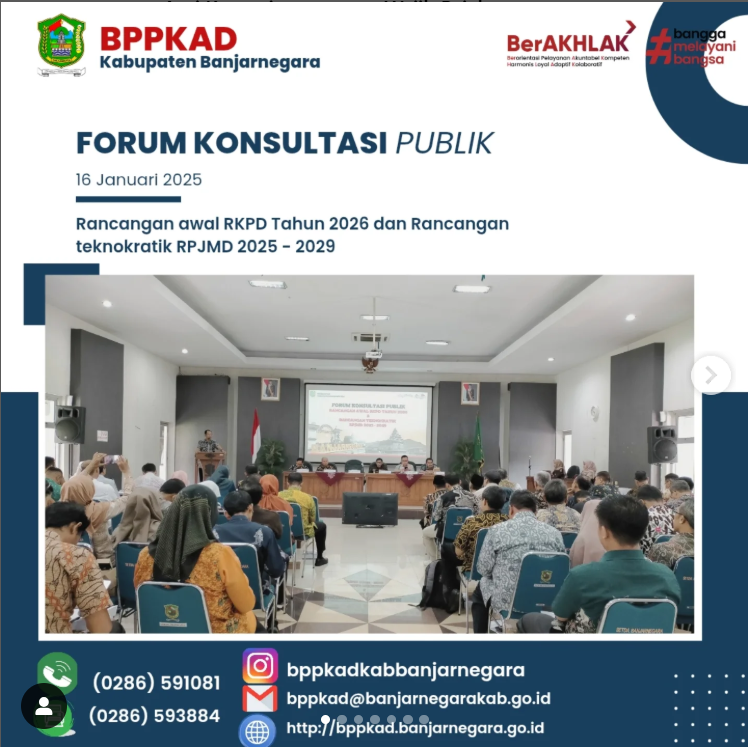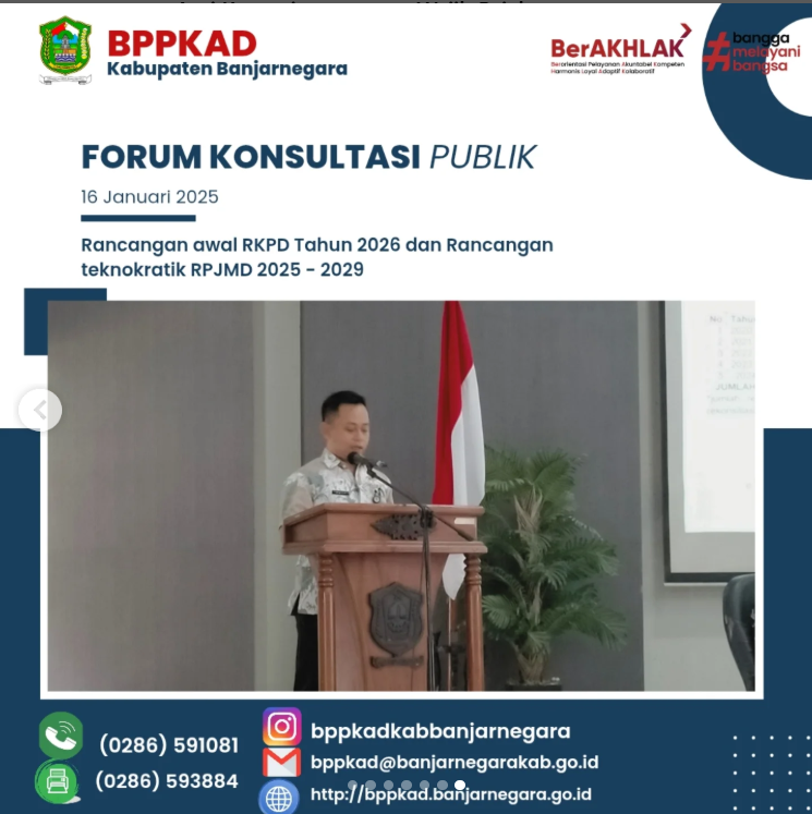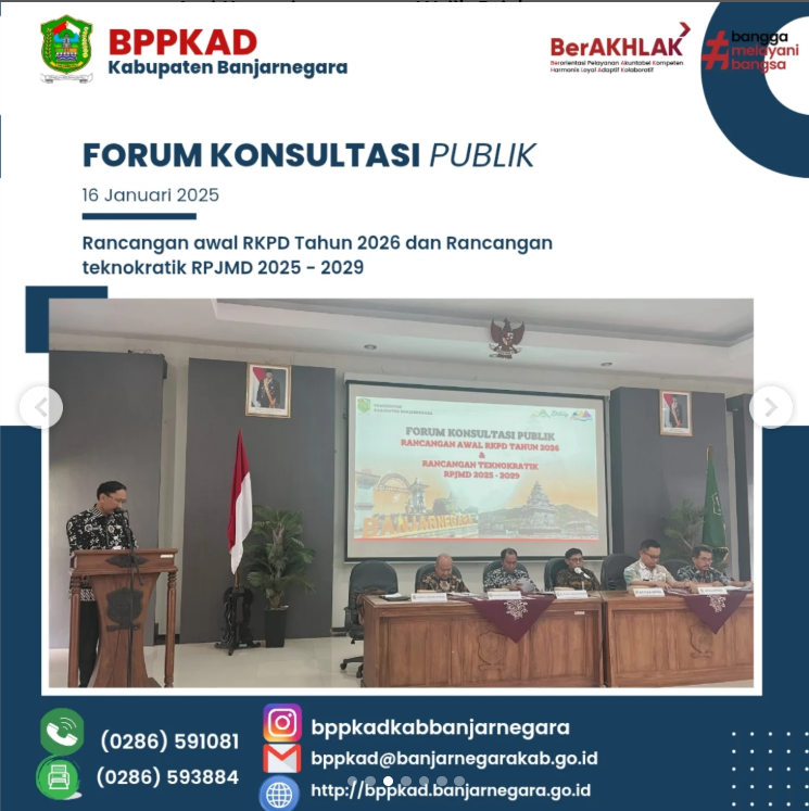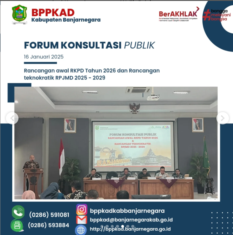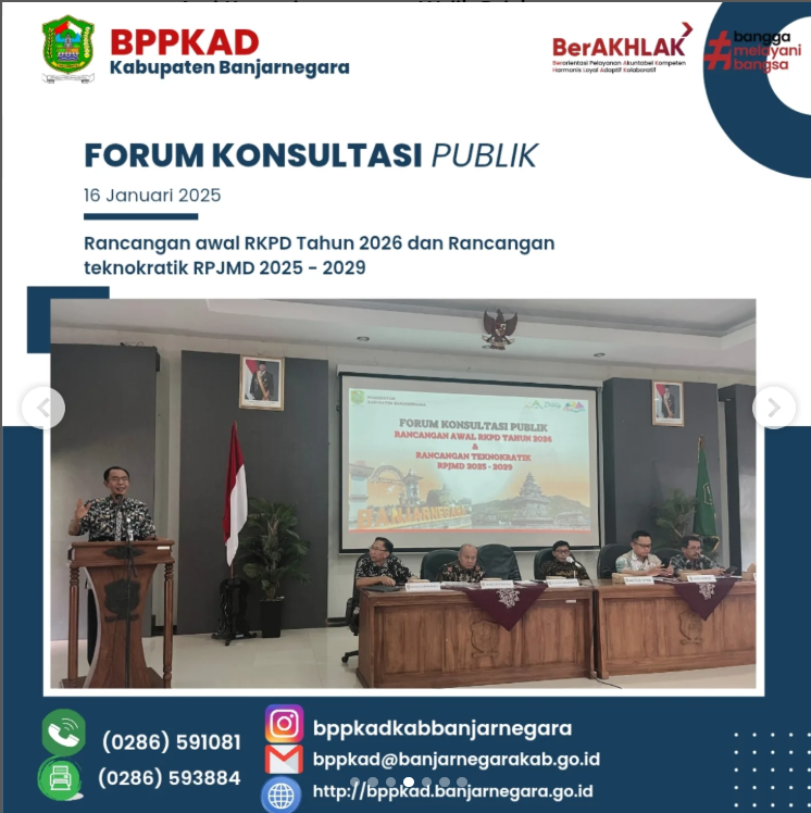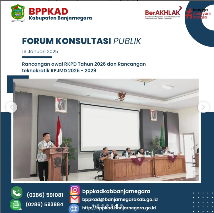 Dalam rangka melaksanakan ketentuan Peraturan Menteri Dalam Negeri Nomor 86 Tahun 2027 tentang Tata Cara Perencanaan, Pengendalian dan Evaluasi Pembangunan Daerah, Tata Cara Evaluasi Rancangan Peraturan Daerah tentang RPJPD dan RPJMD, serta Tata Cara Perubahan RPJPD, RPJMD dan RKPD, Pemerintah Daerah Kabupaten Banjarnegara menyelenggarakan Forum Konsultasi Publik guna memperoleh masukan dan saran penyempurnaan atas rancangan awal RKPD Tahun 2026 dan rancangan Teknokratik RPJMD Tahun 2025-2029 dari Kepala Perangkat Daerah dan para pemangku kepentingan lainnya.