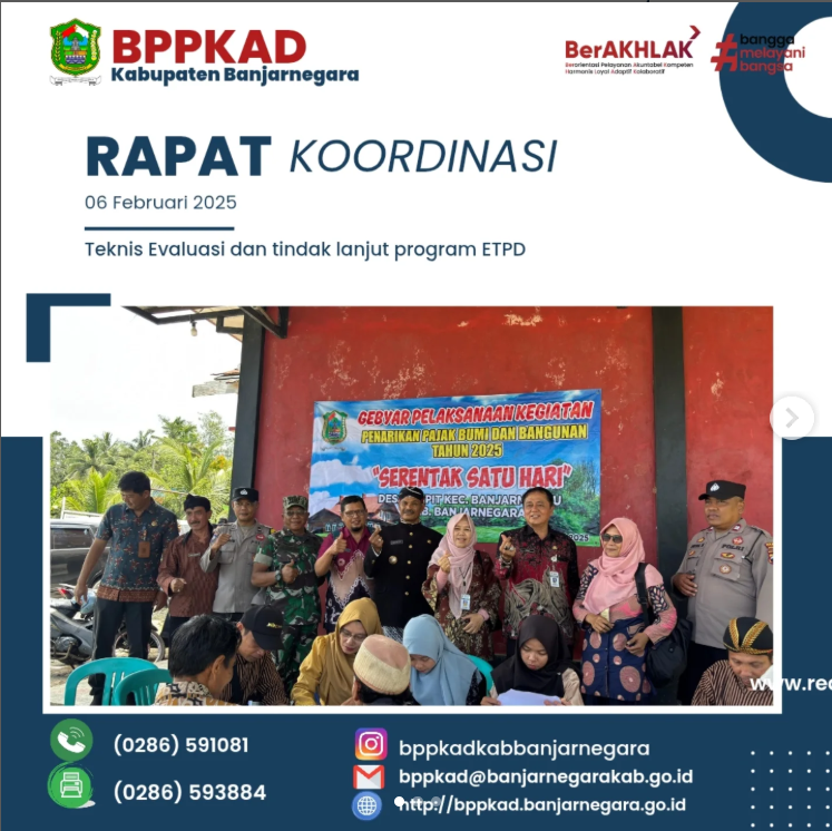 Penarikan setoran PBB P-2 rencana akan dilanjutkan sampai dengan akhir bulan Februari 2025, yang diupayakan pelunasan murni dari setoran Wajib Pajak. Dengan harapan untuk bisa mengikuti Kejuraan Lunas Tercepat PBB yang akan diselenggarakan BPPKAD Tgl. 05 Maret 2025 pukul 10.00 di Aula Gd. C BPPKAD secara bersama-sama dengan peserta dari Desa berbagai Kecamatan.