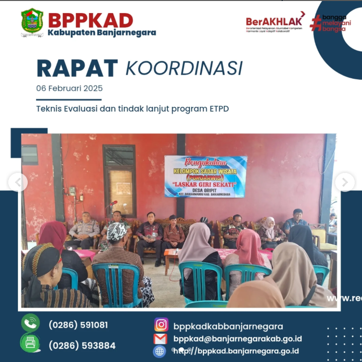 a. Pengukuhan Kelompok Sadar Wisata (POKDARWIS ) “ LASKAR GIRI SEKATI” Desa Gripit Kecamatan Banjarmangu, dengan unggulan Desa Wisata yaitu Wisata Religi “Makam Sunan Gripit” yang dihadiri oleh Plt. Camat Banjarmangu beserta pejabat Struktural dan OPD terkait yaitu Pejabat Struktural dan staf pada masing-masing OPD Dinas Pariwisata dan DISPERMADES PPKB.