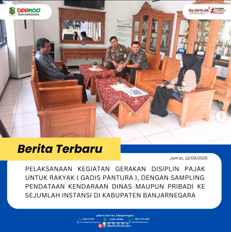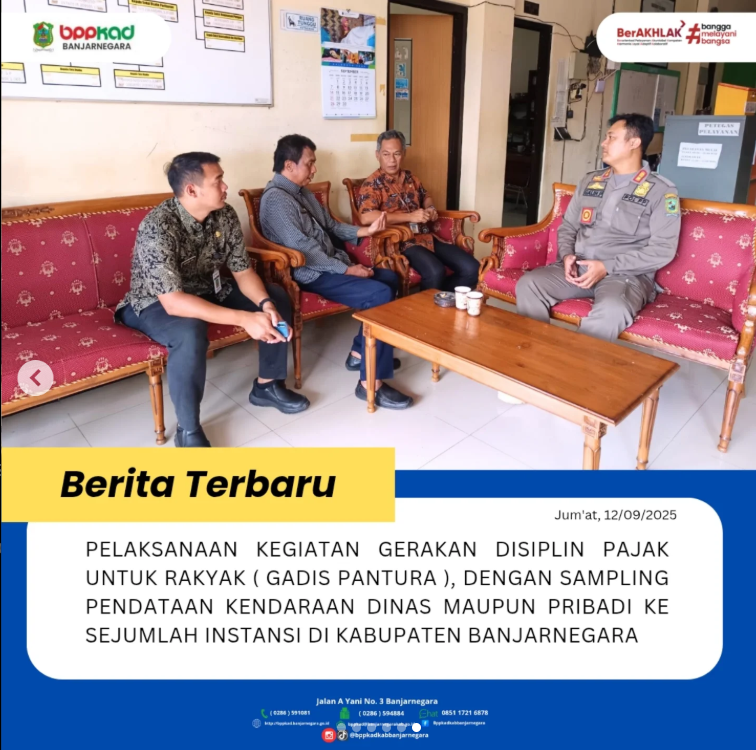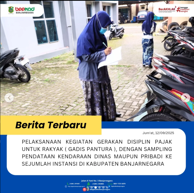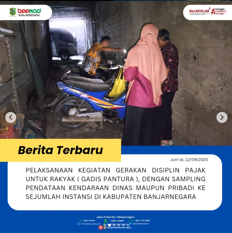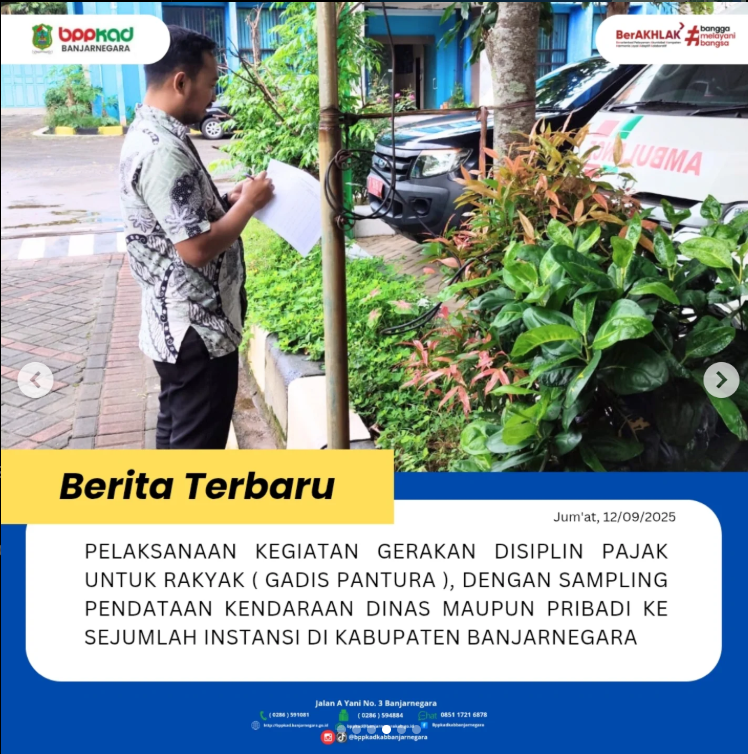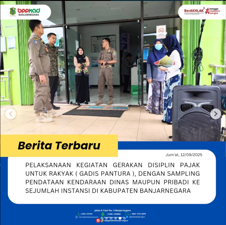 Badan Pengelolaan Pendapatan, Keuangan, dan Aset Daerah (BPPKAD) Kabupaten Banjarnegara bersama UPPD Samsat Banjarnegara serta didukung Satpol PP Kabupaten Banjarnegara melaksanakan kegiatan GADIS PANTURA (Gerakan Disiplin Pajak Untuk Rakyat).