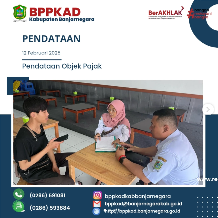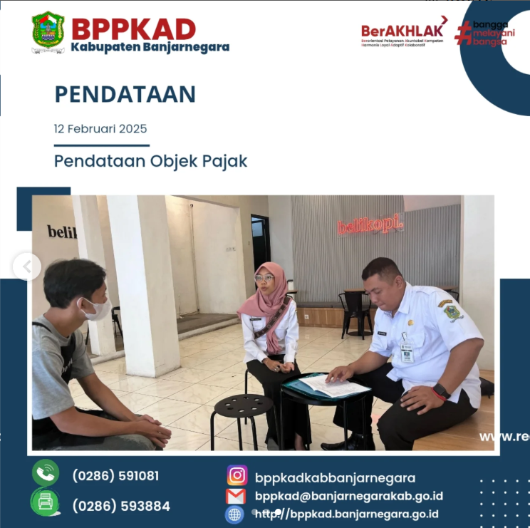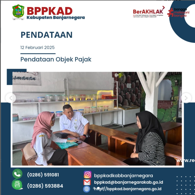 Rabu, 12 Februari 2025. Bidang Pendapatan Daerah Lainnya BPPKAD Kabupaten Banjarnegara melakukan pendataan terhadap usaha yang termasuk ke dalam Objek Pajak Daerah Kabupaten/Kota. Kegiatan pendataan tersebut merupakan kegiatan rutin yang dilakukan sebagai upaya ekstensifikasi untuk memperluas basis perpajakan.