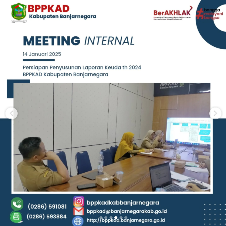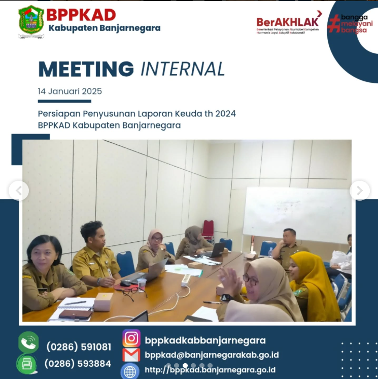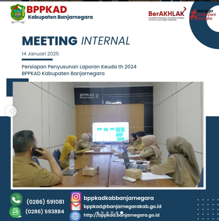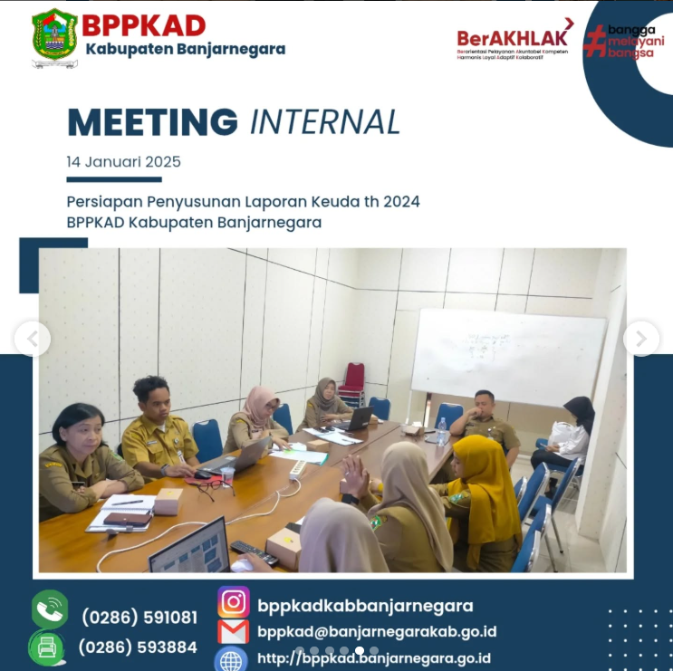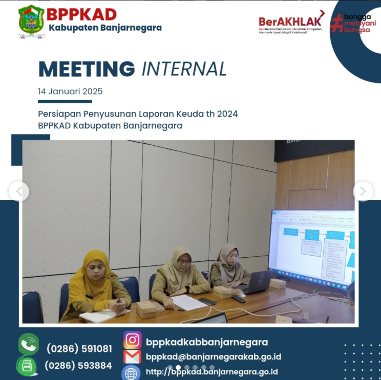 Plt. Kepala BPPKAD Kabupaten Banjarnegara ( Bapak Aditya Agus Satria M.Ec.Dev.,MA,Ak,CA ) bersama Sekretaris ( Ibu Dra. Siti Mutmainah ) , Kabid ( Ibu Puji Rahayu, SE ), para Kasi dan Staf Bidang AKUNTANSI dan PENGOLAHAN DATA, Perencana Ahli Muda ( Ibu Dwi Ari Setyaningrum, SE ) , Pranata Komputer Ahli Muda ( Sdr. Sodik Kirono, S.Komp ) mengadakan meeting internal dalam rangka persiapan penyusunan Laporan Keuangan Daerah Th 2024. Beberapa pokok bahasan dalam pertemuan tersebut diantaranya terkait dengan progres penyusunan laporan keuangan, kendala-kendala yang dihadapi , upaya/langkah2 percepatan yang akan dilakukan dalam penyelesaian penyusunan dan penyajian laporan keuangan serta membahas hal-hal krusial lain yang menjadi tusi Bidang Akuntansi.