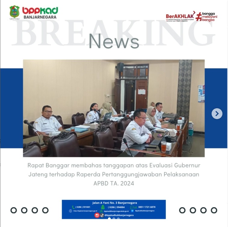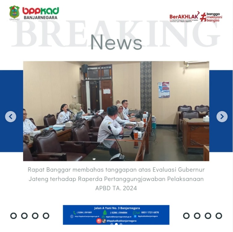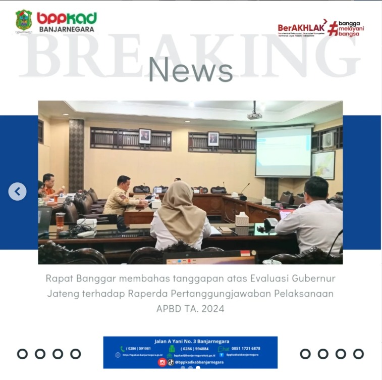 Sesuai jadwal kegiatan DPRD Kab. Banjarnegara Tahun 2025 masa persidangan bulan Juli 2025, pada Hari Rabu/ 30 Juli 2025 dilaksanakan Rapat Banggar membahas tanggapan atas Evaluasi Gubernur Jateng terhadap Raperda Pertanggungjawaban Pelaksanaan APBD TA. 2024 dilanjutkan Rapat Banggar membahas Laporan Keuangan Pemerintah Kabupaten Banjarnegara TA. 2025 Semester 1.
