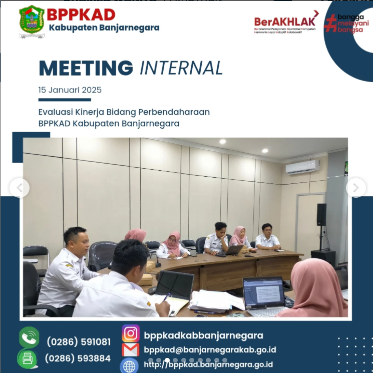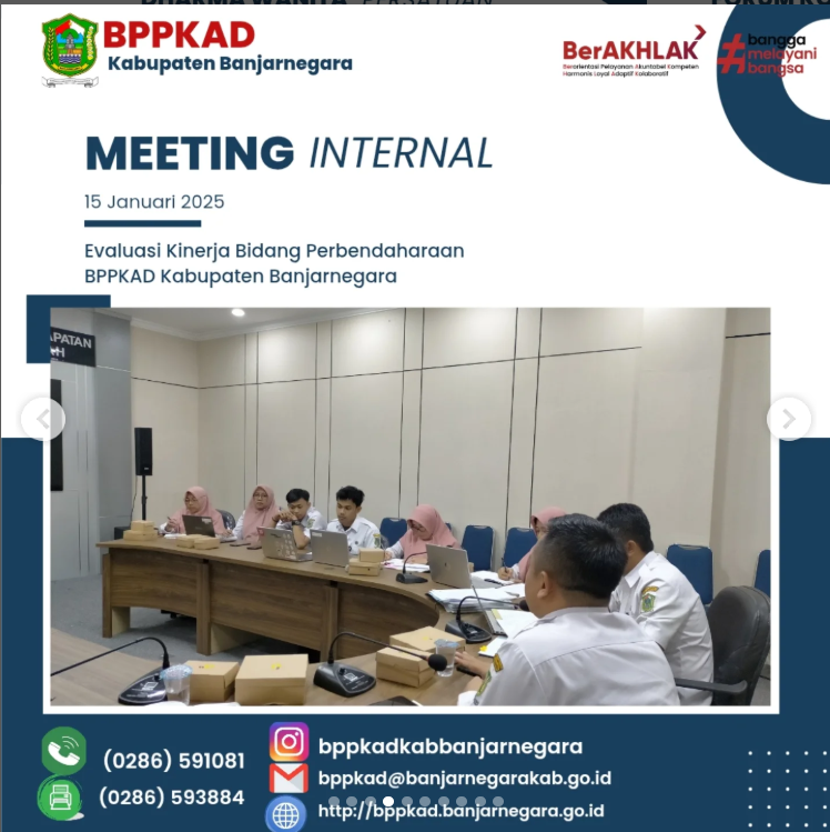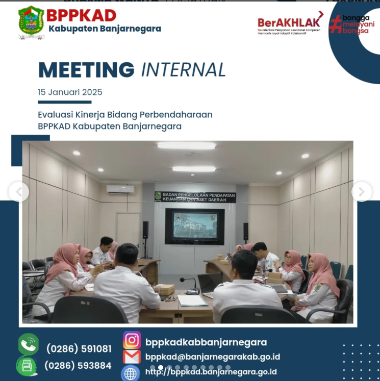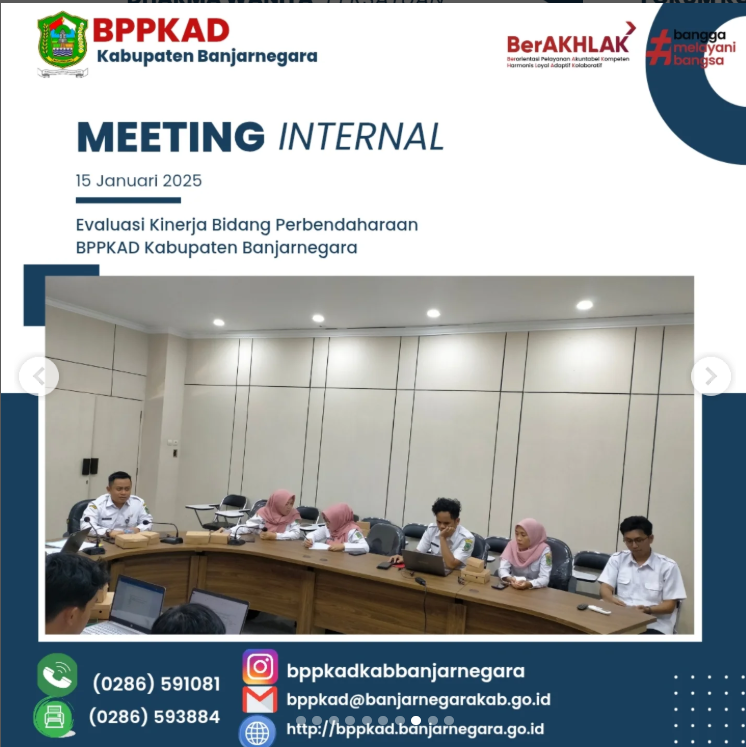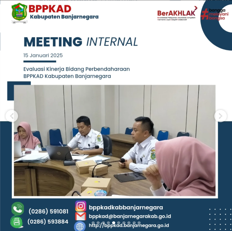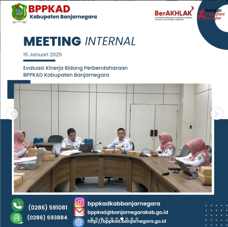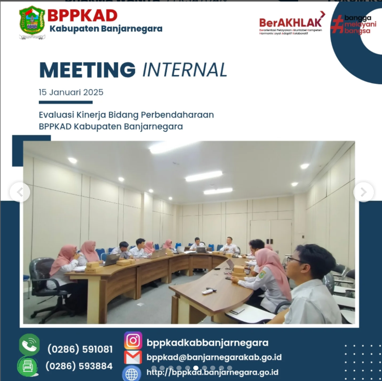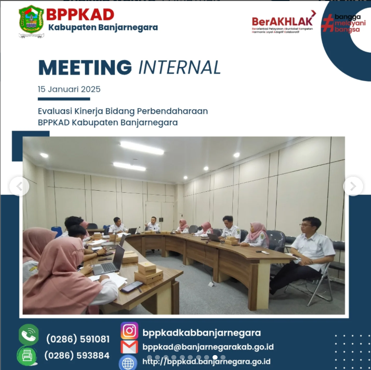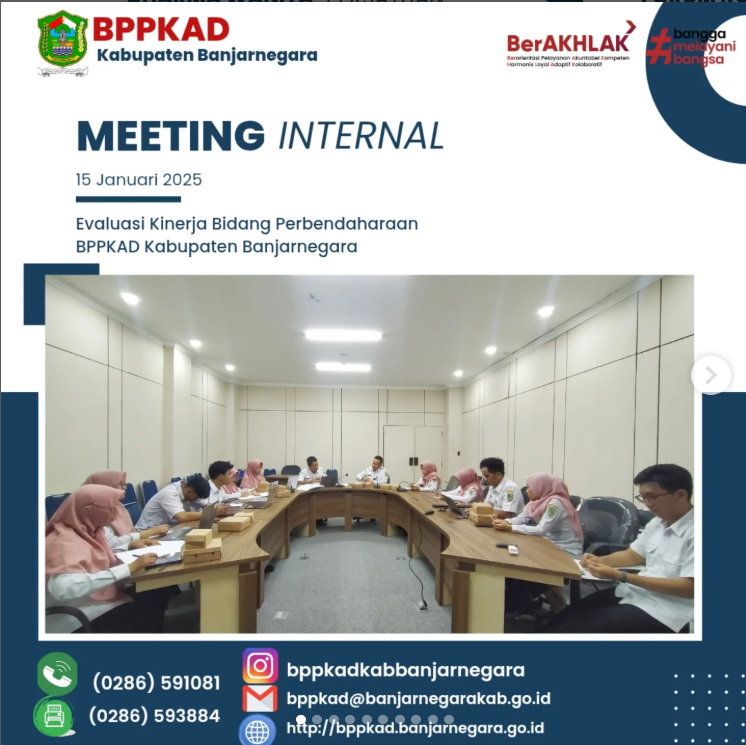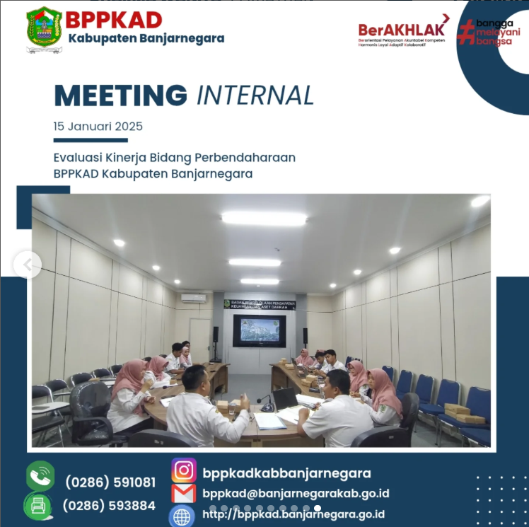Dalam rangkaian evaluasi kinerja bidang-bidang se BPPKAD Kabupaten Banjarnegara, pada hari Rabu tanggal 15 Januari 2025 telah dilaksanakan Rapat Evaluasi Kinerja Bidang Perbendaharaan dan Kas Daerah yang dipimpin langsung oleh Plt Kepala BPPKAD Kab. Banjarnegara (Bapak Aditya Agus Satria, M.Ec.Dev.,MA,Ak,CA ) didampingi Sekretaris Badan ( Ibu Dra. Siti Mutmainah ) beserta tim sekretariat dan diikuti seluruh jajaran di Bidang Perbendaharaan dan Kas Daerah.