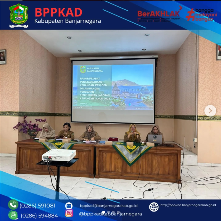 Rapat Koordinasi Persiapan Penyusunan Laporan Keuangan Tahun 2024 dilaksanakan pada Hari Selasa/3 Desember 2024 di gedung B lantai 3 BPPKAD Kab.Banjarnegara, rapat dibuka oleh Sekretaris BPPKAD Kabupaten Banjarnegara Ibu Dra. Siti Mutmainah dilanjutkan sosialisasi Perbup 42 Tahun 2024 ttg Kebijakan Akuntansi Daerah, paparan probis penyusunan Laporan Keuangan.