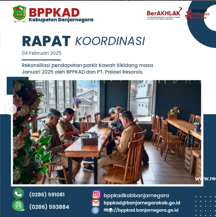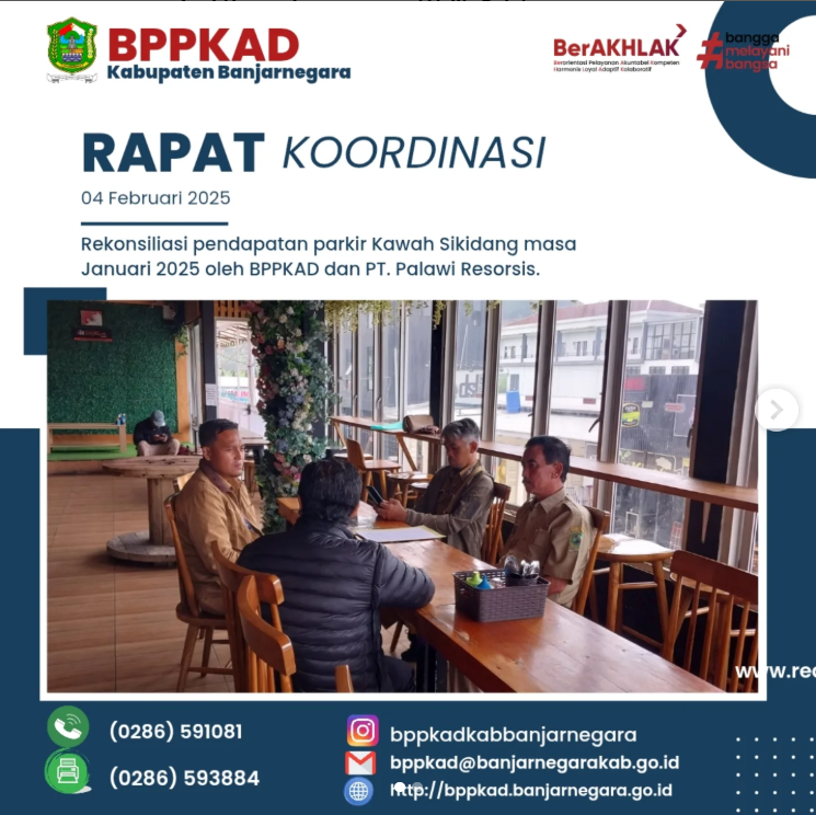 Selasa, 4 Februari 2025 || Berlokasi di Kedai Mie Ongklok Dieng telah dilaksanakan rekonsiliasi pendapatan parkir Kawah Sikidang masa Januari 2025 oleh BPPKAD dan PT. Palawi Resorsis. Selain rekonsiliasi pendapatan, pada hari yang sama juga telah dilaksanakan pemantauan parkir kawah sikidang serta pelatihan penggunaan alat perekam transaksi online pajak daerah bagi pengelola parkir Kawah Sikidang. Rangkaian kegiatan ini dihadiri oleh PT. Palawi Resorsis, Disparbud, BPPKAD dan PT. Subaga Mitra Solusi sebagai bentuk optimalisasi Pendapatan Asli Daerah (PAD) khususnya dari sektor PBJT atas penyelenggaraan parkir.
